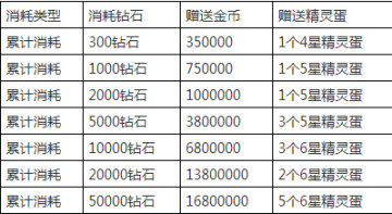 舉例:活動期間內總共消耗2000鑽石,總共可獲得210萬金幣。5星精靈蛋2個,4星精靈蛋1個。