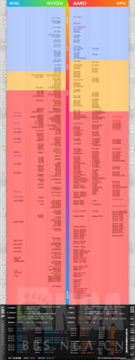 先查看下顯卡天梯圖片,如下圖所示(點擊小圖看大圖)。如果是紅色區域,那麼你需要更換一塊處於黃色與藍色區域的顯卡