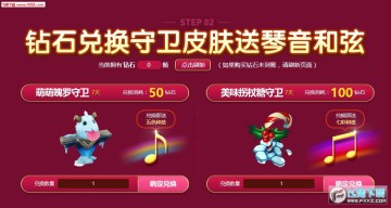 2.使用鑽石兌換守衛皮膚,其中 50 鑽石兌換一份“萌萌魄羅守衛( 7 天)”,將獲得贈“五色和弦”一份; 100 鑽石兌換一份“美味拐杖糖守衛( 7 天)”,將獲得贈“七彩和弦”一份。兌換多份珍稀守衛皮膚,使用時間疊加計算。
