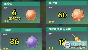 5:準備魚餌為6個果釀餌,60個酸桔餌,36個甘露餌,12個維護機關頻閃誘餌;